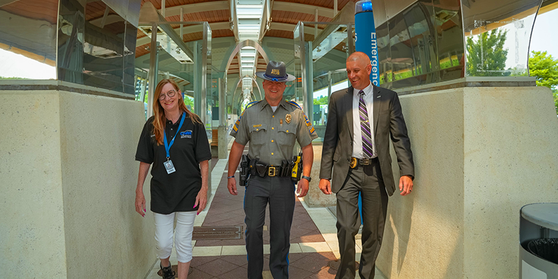 The State Police presence on CTfastrak began in 2021 with support from CTDOT. They aimed to assign dedicated troopers to the system much like a residency trooper program, where the officers live in the community they serve and build relationships with transit staff and customers alike. This work is centered at Hartford’s Union Station, where the troopers share space with CTtransit, and at the newly renovated operations center at the New Britain CTfastrak station. The Hartford office has been dedicated in honor of Connecticut State Trooper Aaron Pelletier, who was tragically killed in the line of duty and was instrumental in laying the foundation for this partnership.