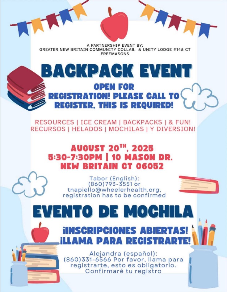 Greater New Britain Community Collaborative and Unity Lodge #148 Connecticut Freemasons Backpack Event