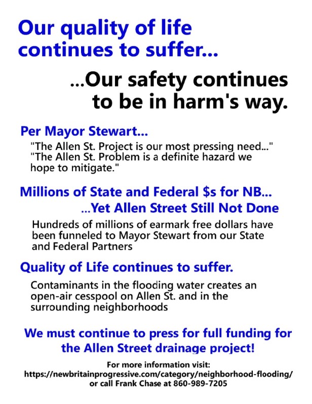 For more information visit: https://newbritainprogressive.com/category/neighborhood-flooding/ or call Frank Chase at 860-989-7205