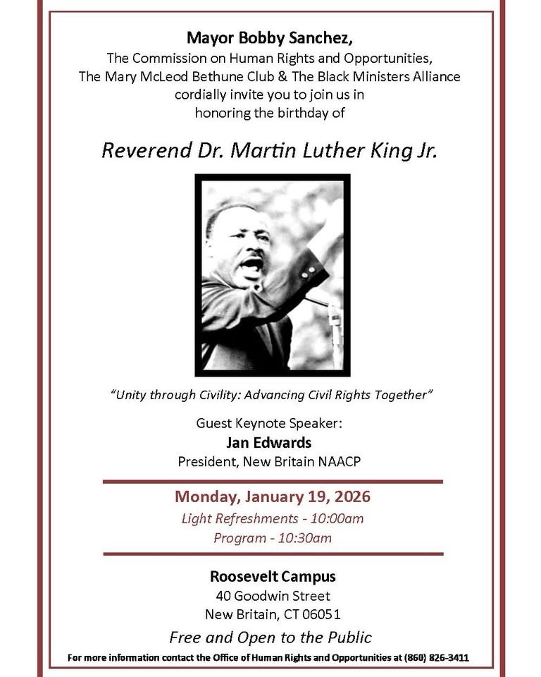 The citywide event, scheduled for Monday, January 19, 2026, will focus on the theme “Unity through Civility: Advancing Civil Rights Together.” The keynote address for the event will be delivered by Jan Edwards, President of the New Britain NAACP. The event will begin with light refreshments at 10:00am, followed by the program at 10:30am.