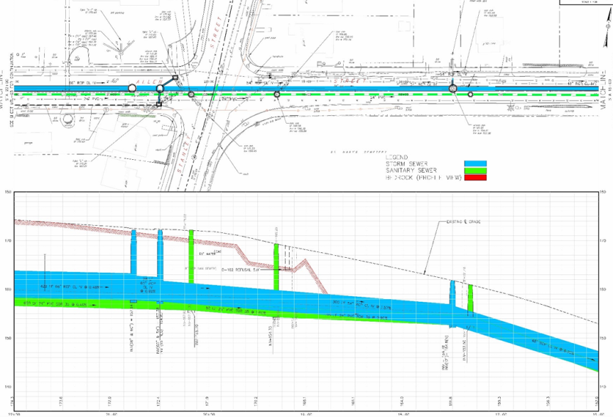 Moriarty cited challenges in implementing the project that has been on the city’s Capital Improvement list for more than a dozen years. The broken infrastructure has led to stormwater and sewage overflows into homes for more than 30 years when high intensity rains occur. The high cost of the project stems from the “deep rock” excavations 20 feet underground that will be required to replace stormwater and sewer mains.