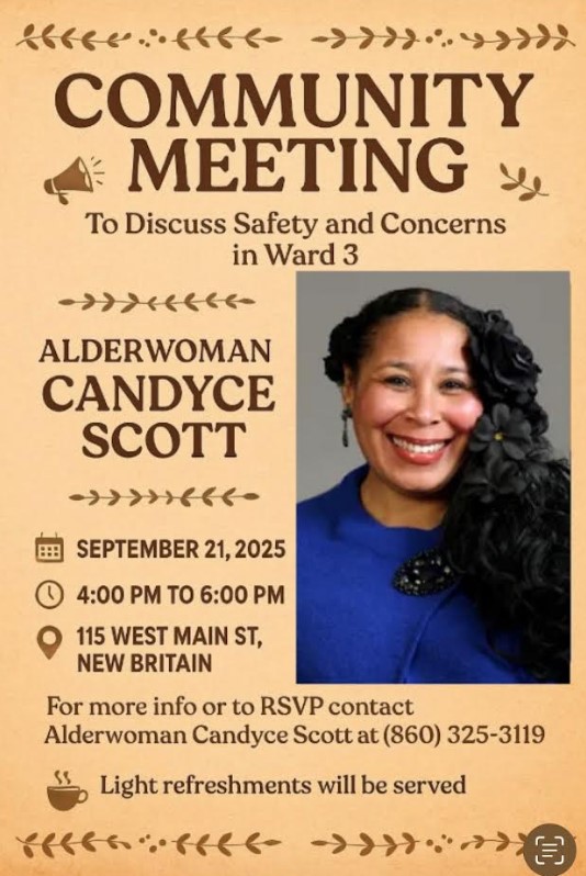 “For more info or to RSVP contact Alderwoman Candyce Scott at (860) 325-3119,” the event announcement says. “Light refreshments will be served.”